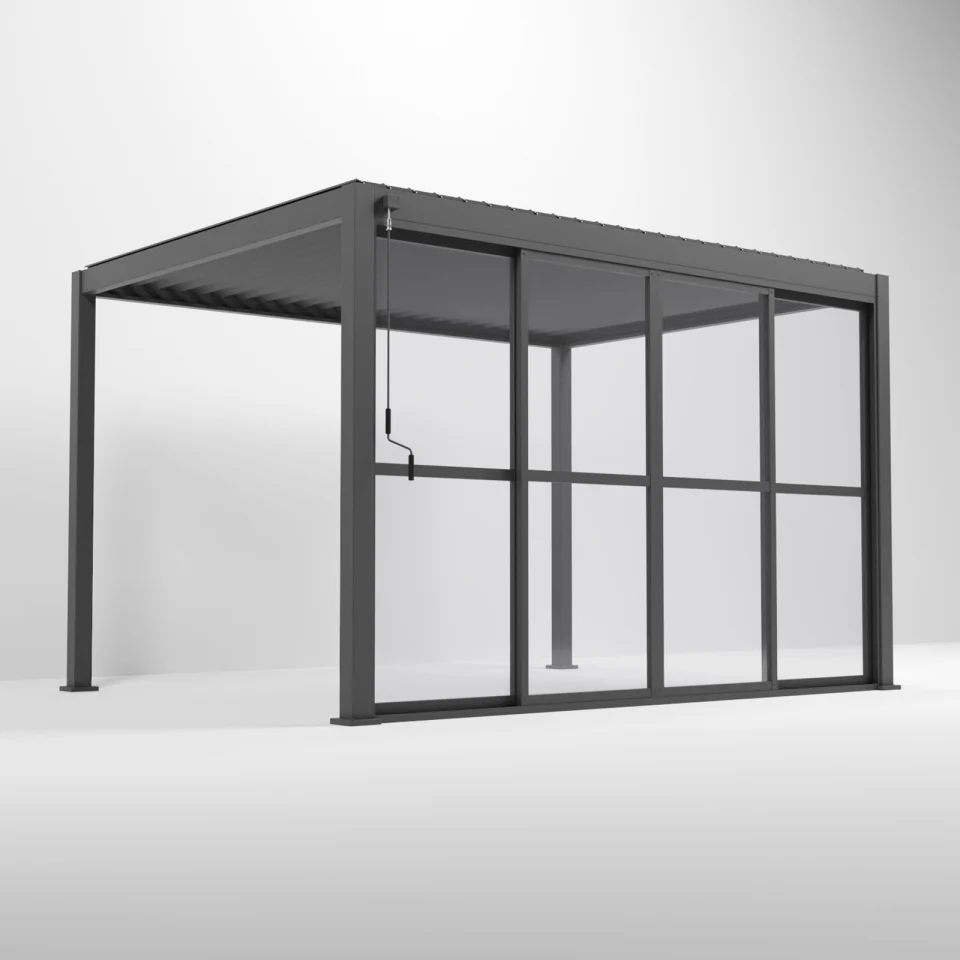 This pergola is the perfect opportunity to extend your outdoor season. Thanks to the 38 tilting double-layer louvres, you can switch between a closed, sheltered space, and an open top to allow sunlight to come flooding in. The roof louvres can be opened/closed using two separate gearboxes, allowing you to customise which side of the roof you want open or closed. Use your outdoor area even when the weather is less than perfect. This pergola ultimately allows you to choose between sitting in sunshine or shade, and provides shelter should it start to rain at a moment’s notice – typical of British weather!